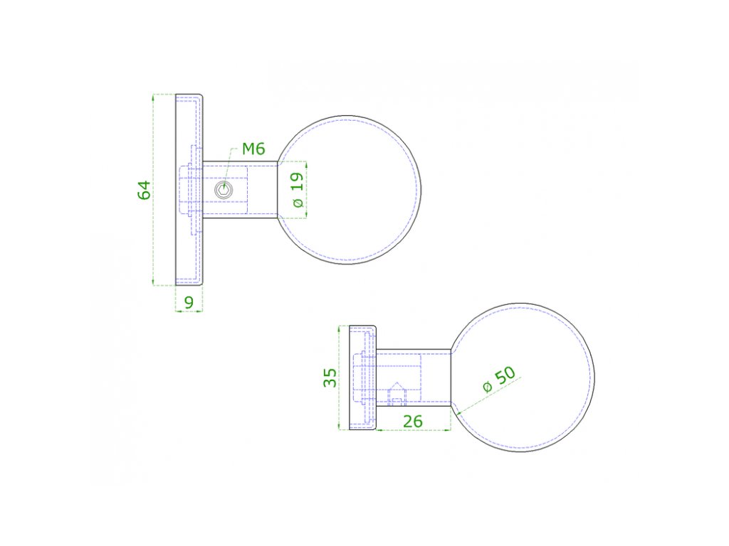 Nerezová ocel AISI304. Broušení K320. Průměr koule 50 mm. Oválná rozeta. Varianty: otočné L/P, neotočné.