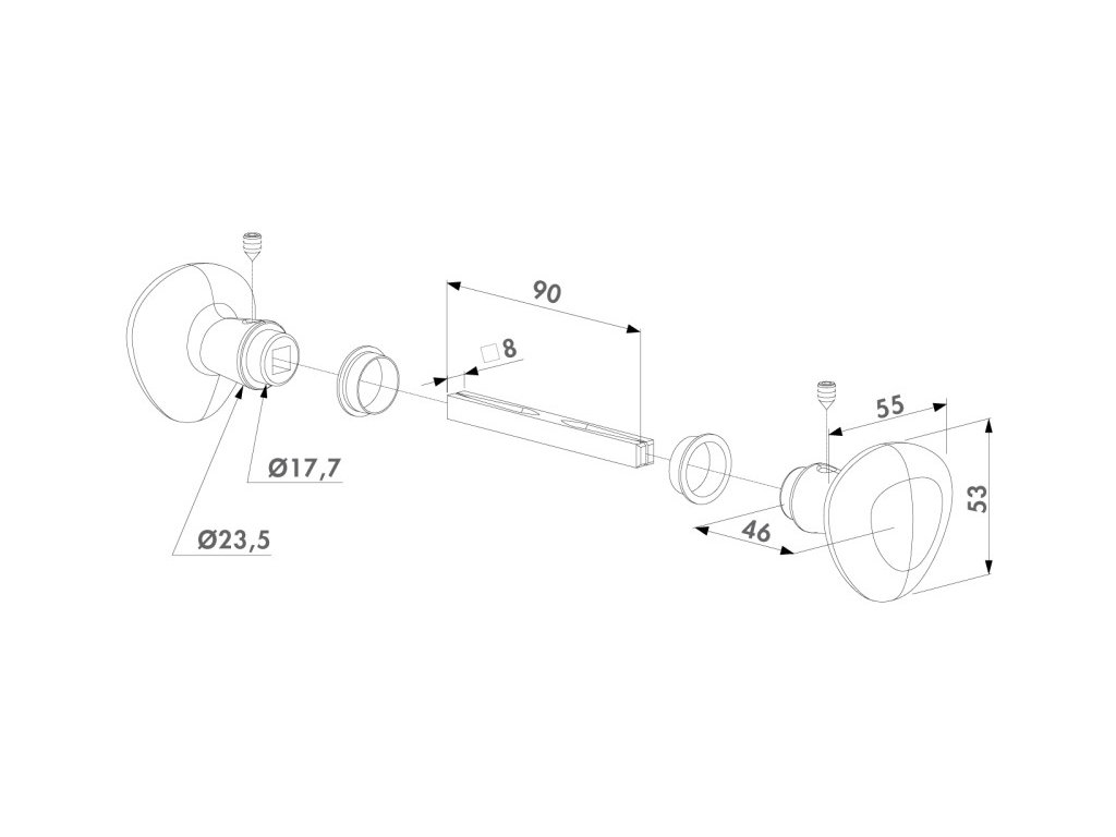 Hliníková rukojeť Locinox 3006R, ve tvaru koule, s vnitřním hranolem 90 mm dlouhým a 8x8 mm.