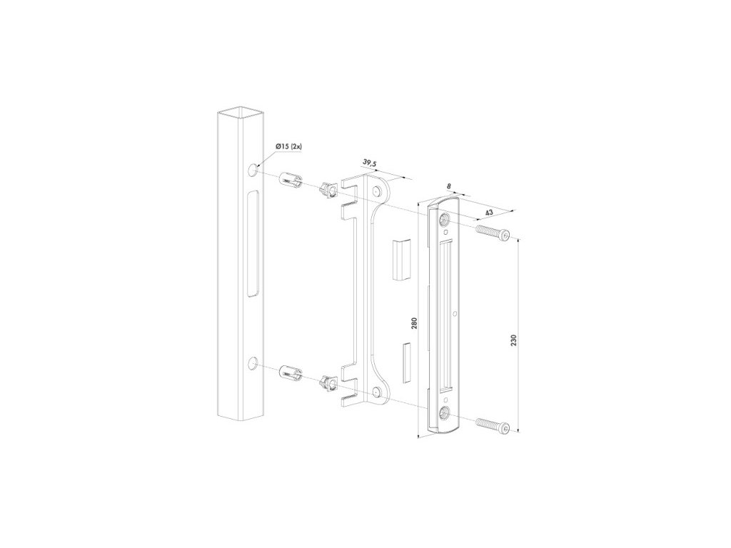 Viditelný přesah zámku po instalaci je pouze 8 mm. Dorazová tyč je široká 39,5 mm.