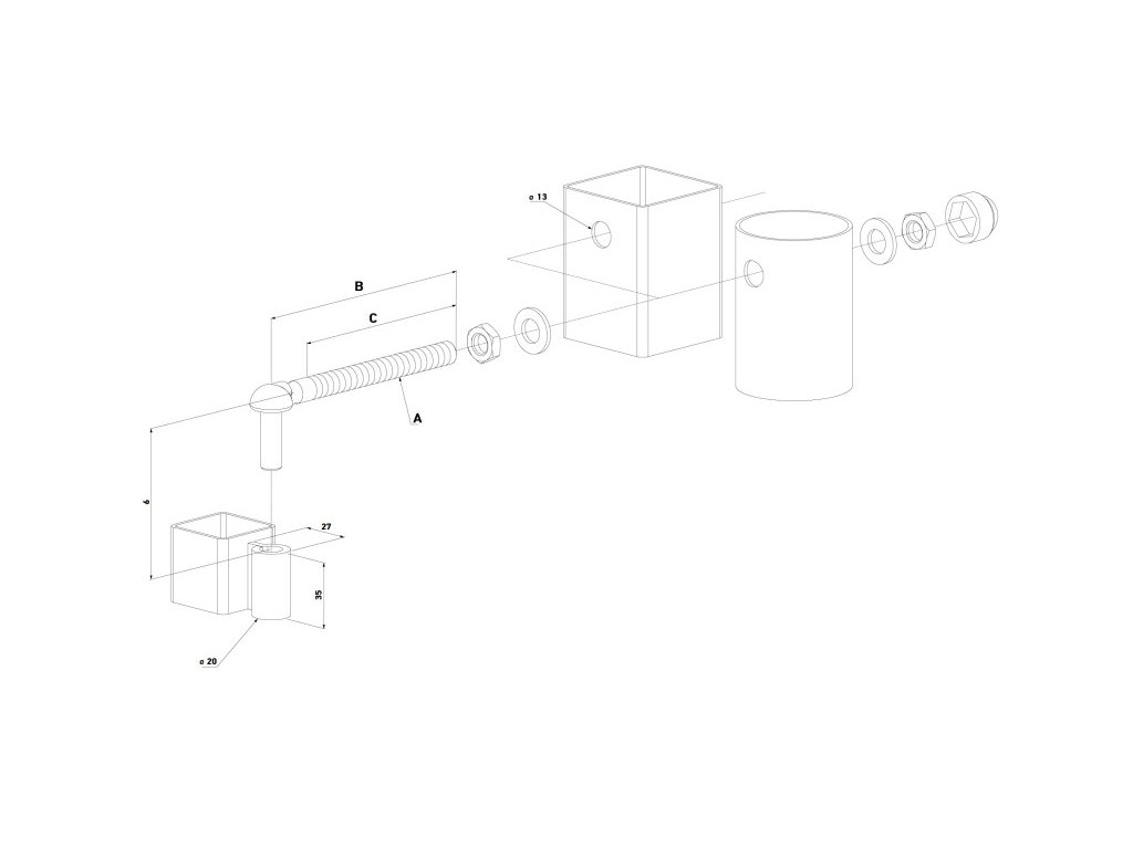 Závěs se ukotví ke sloupku brány pomocí závitové tyče a poté se vloží do očka přivařeného na profilu brány.