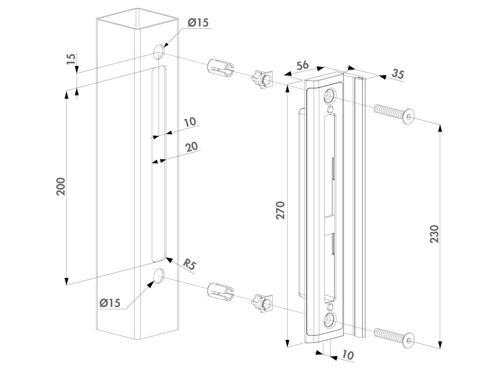 Nerezový protikus zámku LOCINOX SHKM-ALUM, s nerezovým dorazem a pryžovou lištou pro hladký doraz dveří. Pultový díl je vhodný pro profily o šířce 40-60 mm.