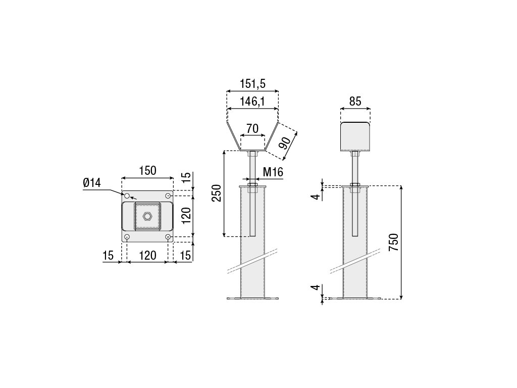 Výškově nastavitelná ramenní opěrka v zavřené poloze, černošedá barva. Lze použít pro ramena o průměru 70 mm i 90 mm.
