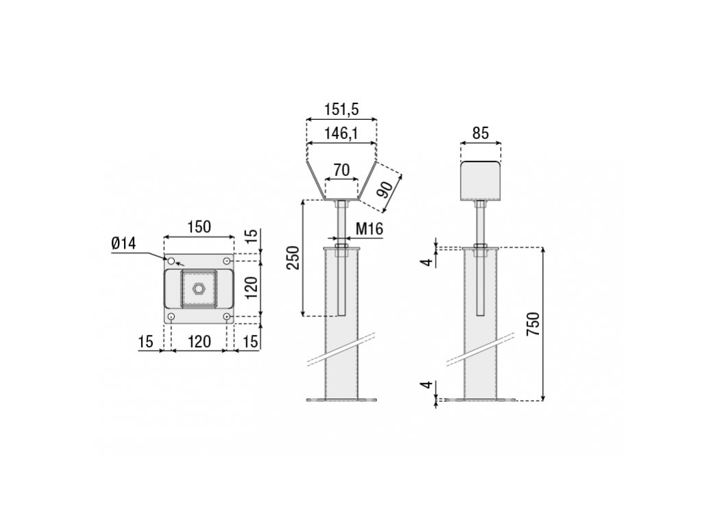 Výškově nastavitelná podpěra ramene v zavřeném stavu, nerezová ocel. Lze použít pro ramena o průměru 70 mm i 90 mm.
