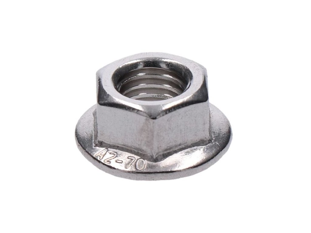 Matice z nerezové oceli s přírubou je specifická tím, že příruba rovnoměrně rozkládá zatížení při utahování matice a zvyšuje její stabilitu. Používají se v situacích, kdy je vyžadována odolnost proti vibracím. Jsou vyrobeny z nerezové oceli A2. Matice odpovídá normě DIN 6923, což znamená, že má normalizované rozměry a vlastnosti.