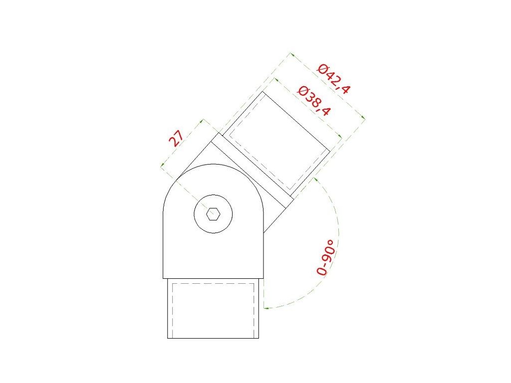 Nerezová, nastavitelná, rohová spojka s kloubem (0°-90°) pro spojení dvou trubek (nejčastěji nerezová madla zábradlí) ⌀42,4x2 mm (vnější průměr trubky 42,4 mm, tloušťka stěny 2 mm), nerezová ocel třídy AISI304 s broušenou povrchovou úpravou.