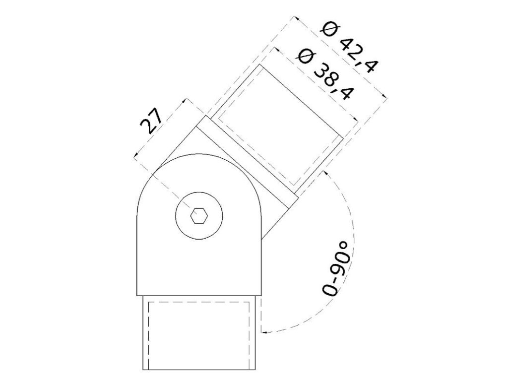 Nerezová, nastavitelná, rohová spojka s kloubem (0°-90°) pro spojení dvou trubek (nejčastěji nerezová madla zábradlí) ⌀42,4x2 mm (vnější průměr trubky 42,4 mm, tloušťka stěny 2 mm), nerezová ocel třídy AISI304 s leštěným povrchem.