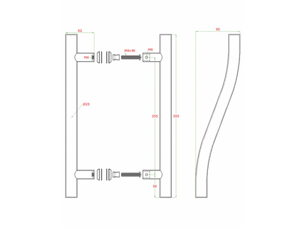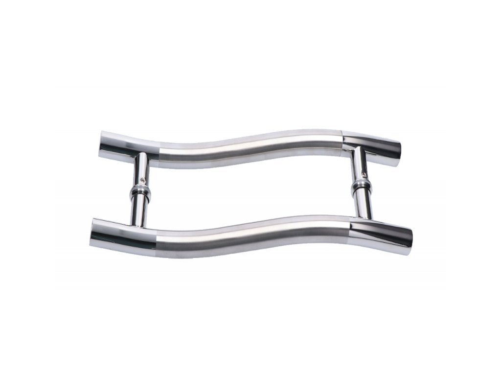Nerezová vlnitá rukojeť o délce 355 mm určená pro dveře/sklo o tloušťce 8-12 mm. Rukojeť je vyrobena z trubek z nerezové oceli o průměru ø 25 mm. Vyrobeno z leštěné/broušené nerezové oceli AISI304 pro vnitřní i venkovní použití.