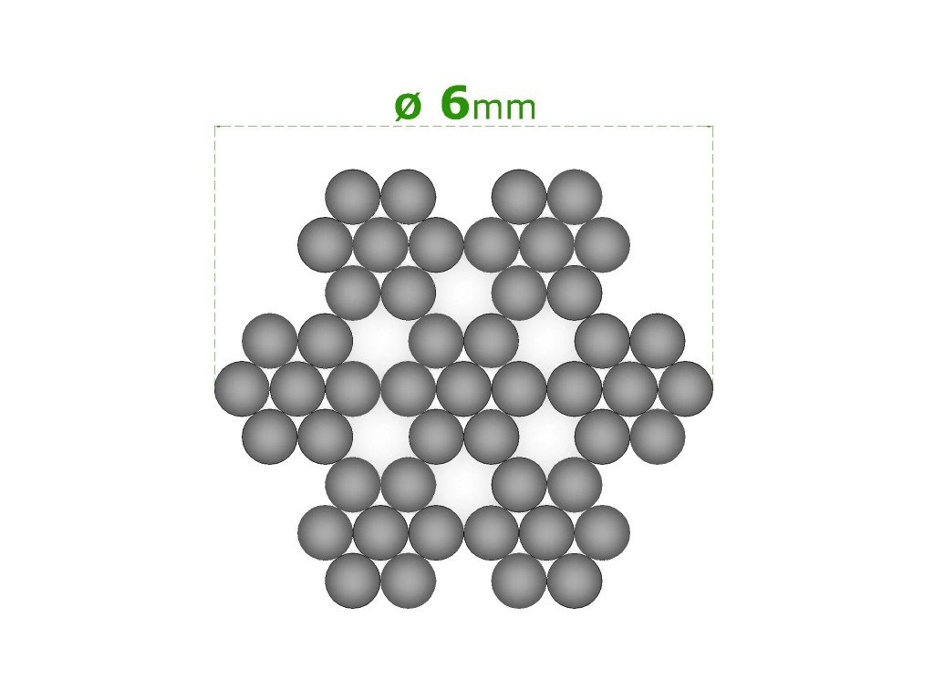 Lano z nerezové oceli, černé, průměr 6 mm, složené ze sedmi svazků po sedmi drátech, vyrobené z vysoce kvalitního antikorozního materiálu AISI316.