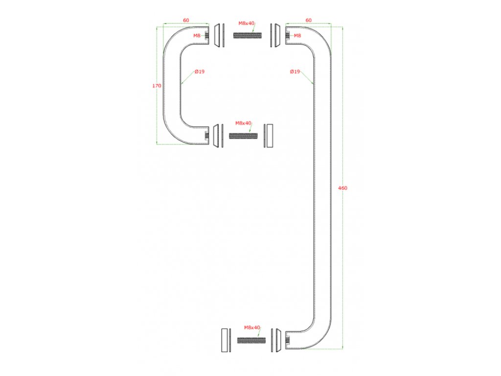 Nerezové madlo o délce 460 mm určené pro dveře/sklo o tloušťce 8-12 mm. Rukojeť je vyrobena z trubek z nerezové oceli o průměru 19 mm. Vyrobeno z broušené nerezové oceli AISI304 pro vnitřní i venkovní použití.