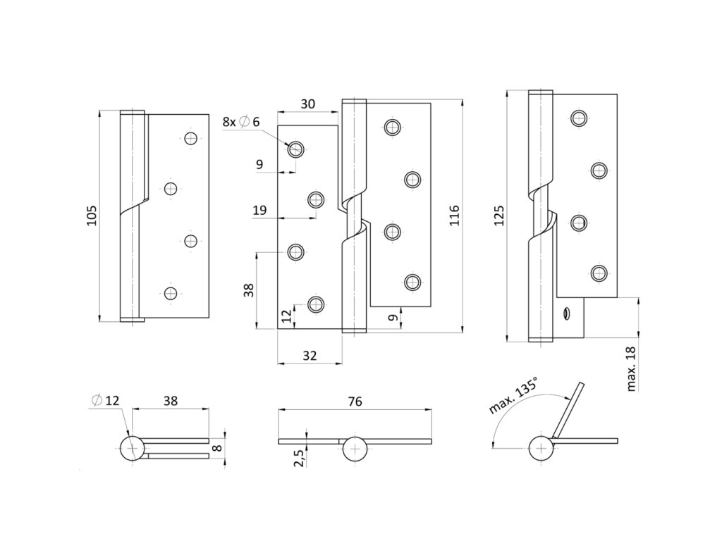 Zvedací závěsy s maximálním úhlem otevření 135°, vyrobené z nerezové broušené oceli K320 / AISI304.
