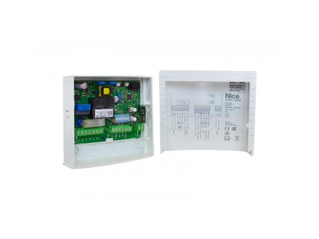 Nová řídicí jednotka NICE MC200 pro jeden asynchronní jednofázový motor 230 V. Řídicí jednotka NICE MC200 nahrazuje starší modely NICE Mindy A01 a NICE Mindy A02. Přijímač zabudovaný v řídicí jednotce je kompatibilní s vysílači FLOR, O-CODE a SMILO.
