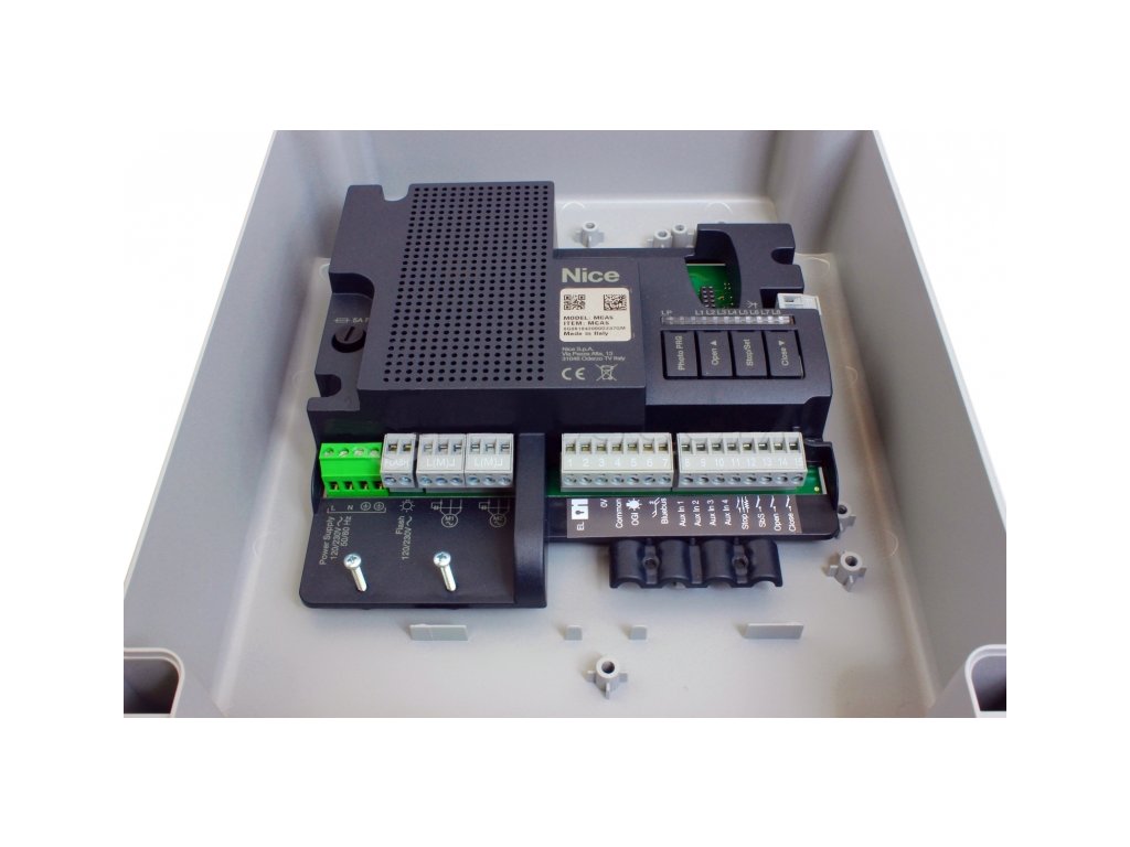 Ovládací panel s řídicí jednotkou NICE MCA5 pro ovládání pohonů 230 V.