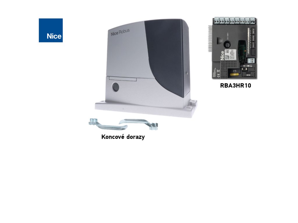 - elektromechanický pohon NICE Robus RB1000 s nosností 1000 kg a maximální délkou křídla 12 m a se zabudovanou(ale odnímatelnou) řídicí jednotkou RBA3R10 bez přijímače rádiového signálu(OXI).