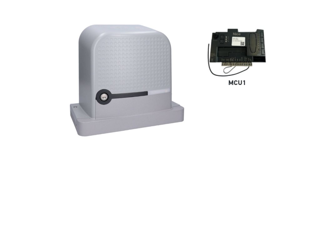 - Elektromechanický pohon NICE Robus RBS600 s nosností 600 kg, maximální délkou křídla 8 m, se zabudovanou (ale odnímatelnou) řídicí jednotkou MCU1, se zabudovaným přijímačem rádiového signálu, i s “SM” konektorem pro zástrčkový přijímač.