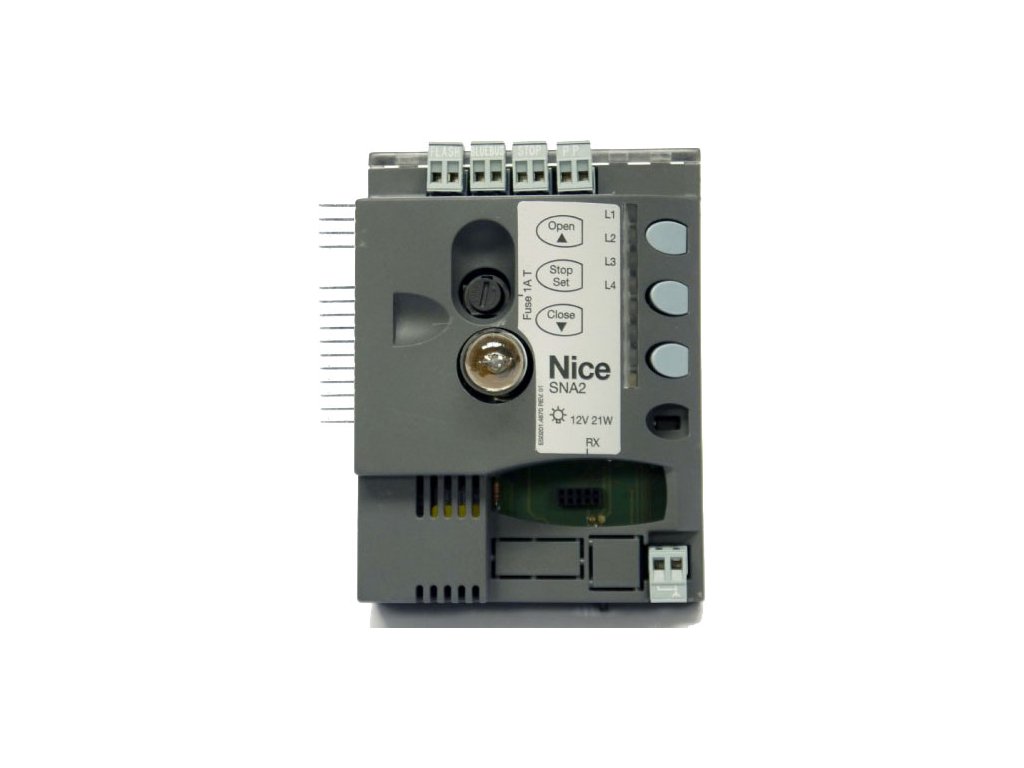 Řídicí jednotka NICE SNA2 je kompatibilní s pohony garážových vrat NICE Spinbus SN6021. Obsahuje konektor typu SM pro připojení přijímače rádiového signálu(SMXI, OXI, ...) z dálkových ovladačů(Flor, Era Flor, Era One, Era Inti, ...).