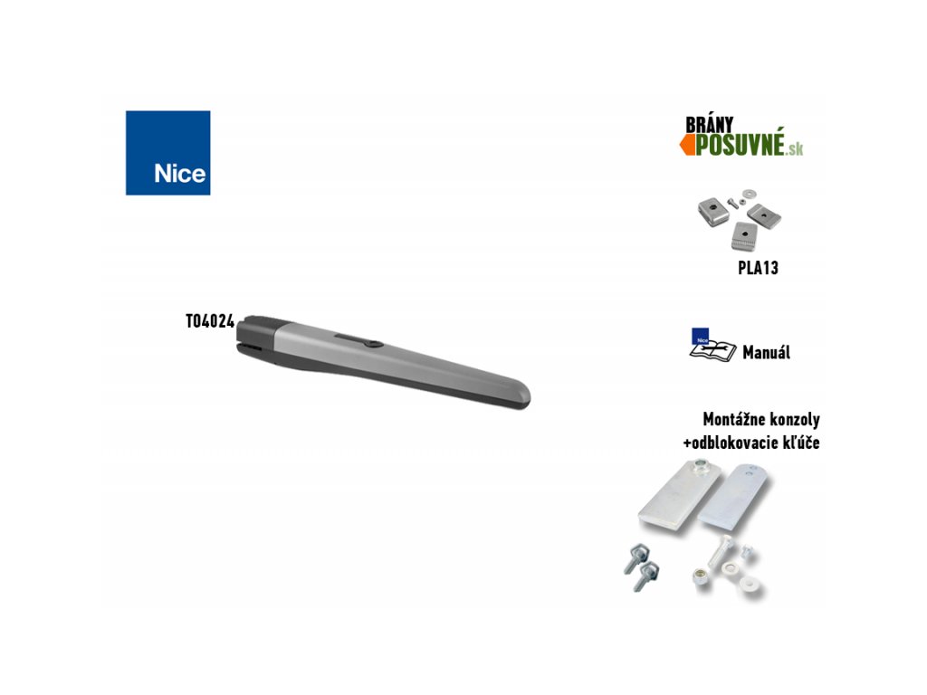 Pohon NICE Toona 4 TO4024 je určen k automatizaci křídlových bran do délky křídla 3 m a hmotnosti do 500 kg. Jednotka je nevratný, je vyroben z dvoudílného hliníkového tlakového odlitku s polyesterovou povrchovou úpravou odolnou proti povětrnostním vlivům. Všechny vnitřní pohyblivé části jsou vyrobeny z oceli, lehkých slitin a technopolymerů. Vodicí matice je vyrobena z bronzu, aby byla zajištěna dobrá pevnost a také tichý chod. Rozběhový kondenzátor je umístěn uvnitř pohonu, aby byla instalace co nejjednodušší. Pohony jsou rozměrově zpětně kompatibilní s předchozími řadami Moby a Pluto italského výrobce NICE, všechny montážní rozměry a průměry čepů jsou stejné. Pohon je vybaven 24V technologií, která je vhodnější pro situace s častějším používáním.m než verze 230V, ale na druhou stranu není vhodný pro větrné prostředí, zejména s neprůhlednými pevnými výplněmi dveří.