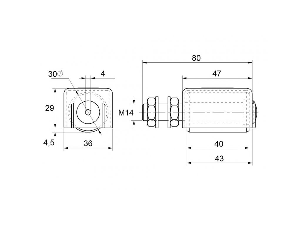 Nylonový váleček o průměru 30 mm se závitem M14 a ochranným krytem je vhodný pro horní vedení posuvných bran.