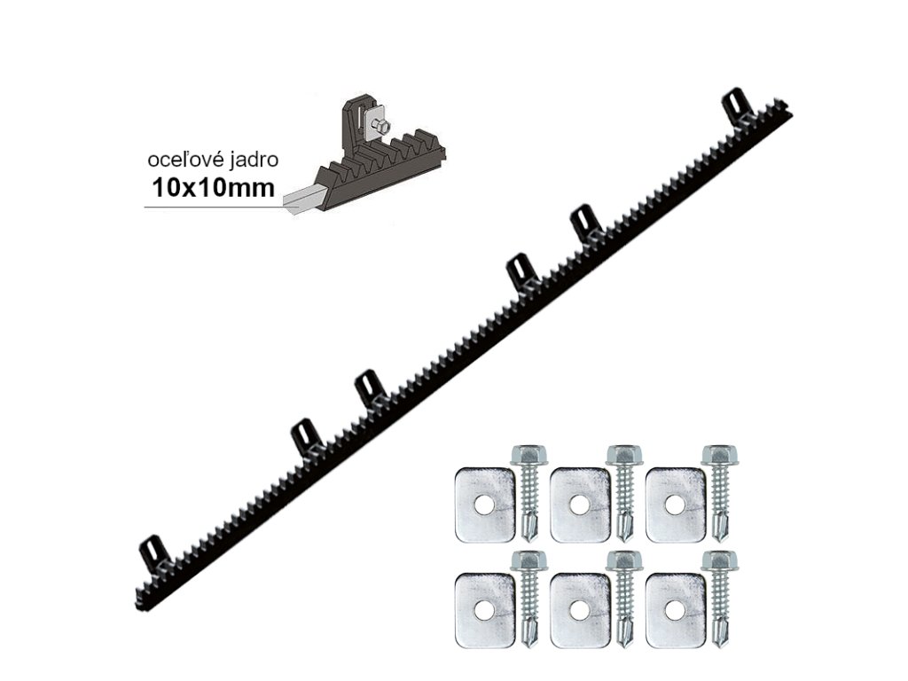 Nylonový hřeben s kovovým jádrem. Zaručuje tišší provoz při posouvání brány. 1 kus tohoto hřebene je dlouhý 1 metr. Tloušťka hřebene je 20 mm, výška zubu 28 mm a rozměr ocelového jádra 10x10 mm.