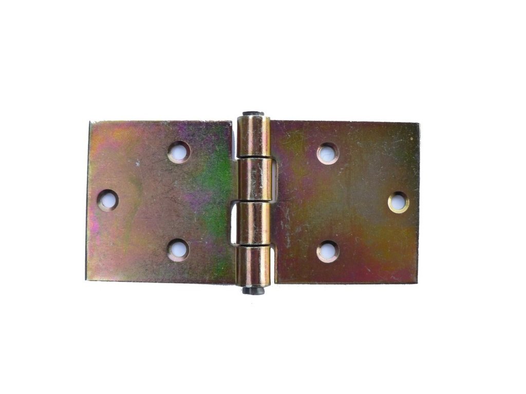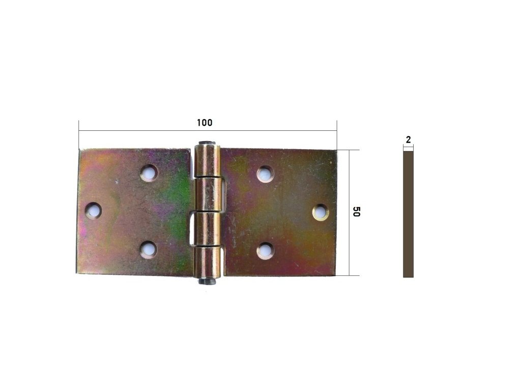 Pásový závěs, pant o rozměrech 100x50 mm a tloušťce 2 mm. Vyrobeno z oceli s povrchovou úpravou žlutým zinkem.