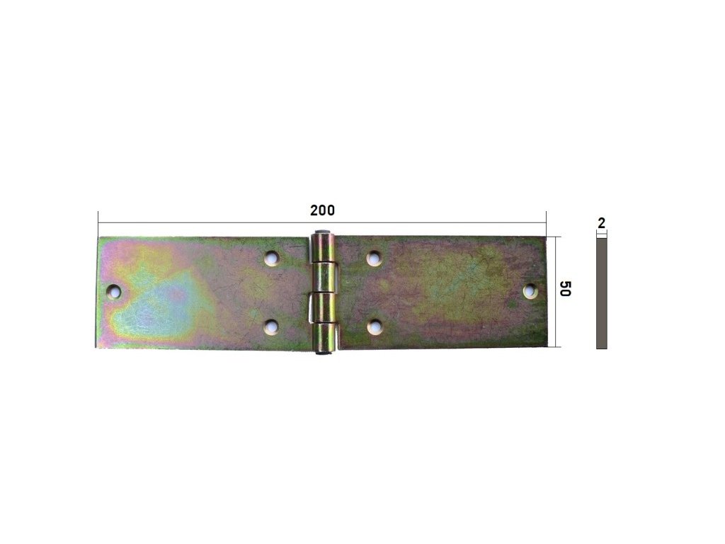 Pásový závěs, závěs o rozměrech 200x50 mm a tloušťce 2 mm. Vyrobeno z oceli s povrchovou úpravou žlutým zinkem.