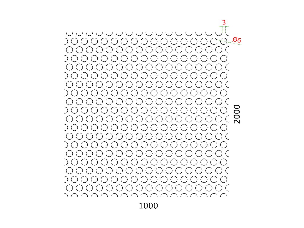 Rozměry plechu jsou 1000 mm x 2000 mm a jeho tloušťka je 1,5 mm. Otvory v plechu o průměru 6 mm a rozteči 9 mm.