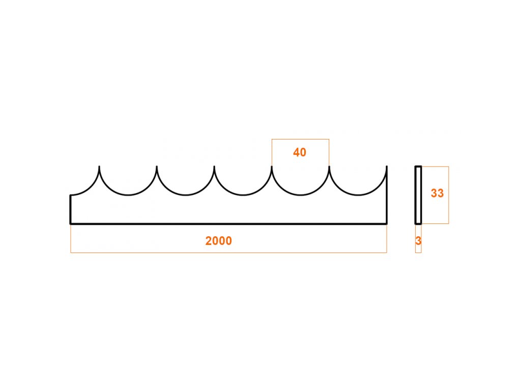 Ostré zakončení brány, délka jednoho kusu 2 m, bez povrchové úpravy. Pila proti šplhání vhodné pro přímé přivaření k rámu brány. Výška pásu je 33 mm.