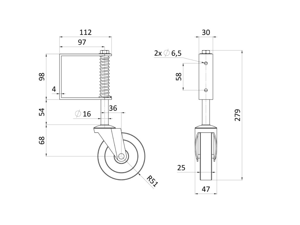 Podpěrné kolo pro křídlovou bránu, nosnost kola je 70 kg, pozinkovaná ocel