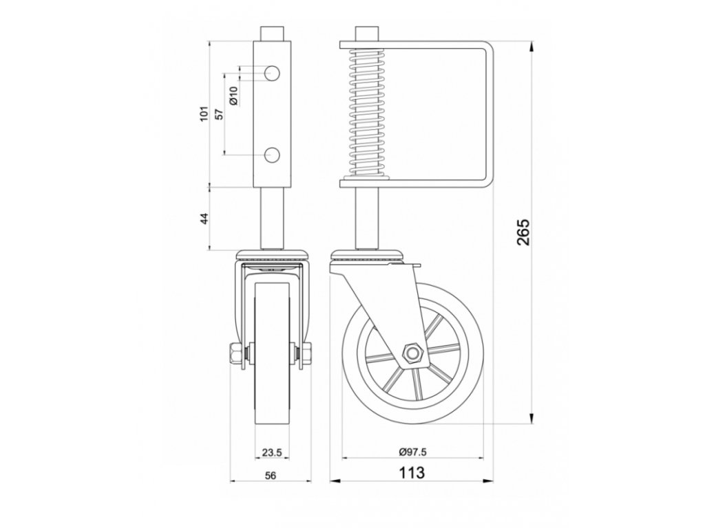 Samotné kolo má průměr 100 mm a je otočné ve všech směrech. Na držáku jsou dva otvory pro šrouby Ø10 mm. Nosnost kola je 75 kg.