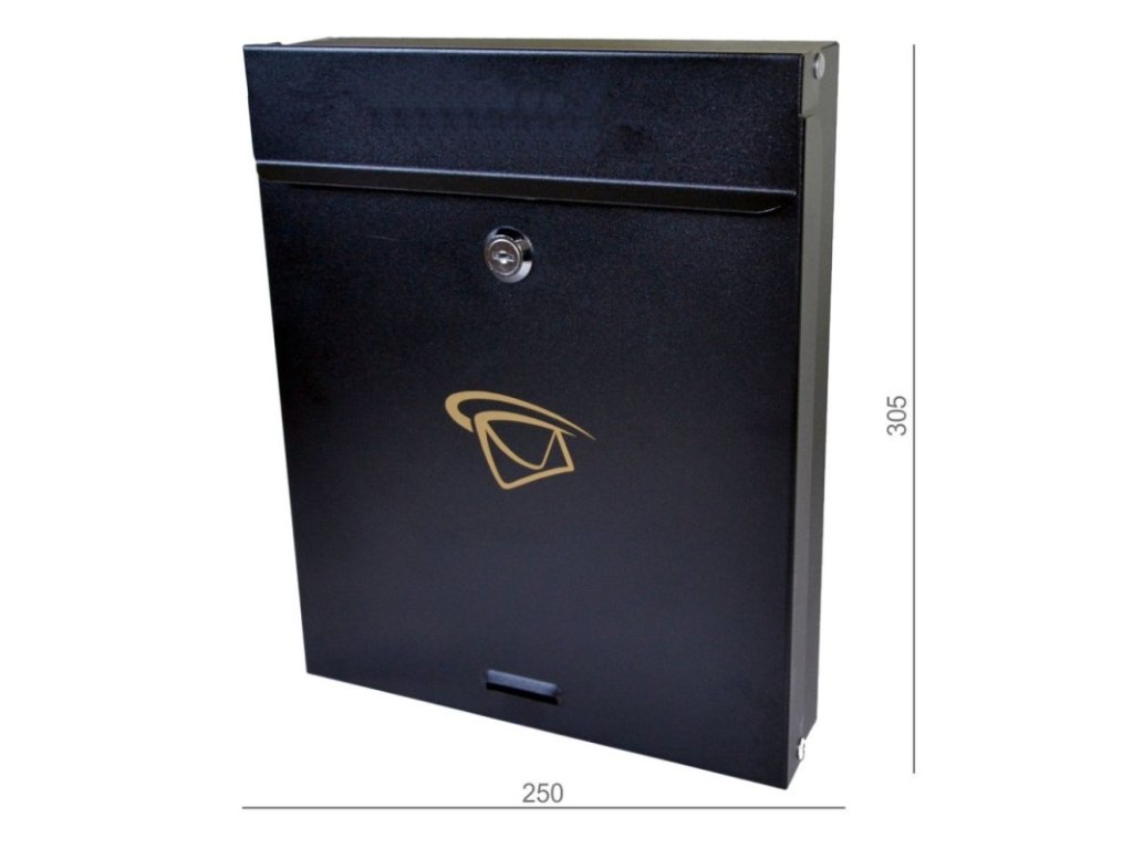 Pozinkovaná poštovní schránka o rozměrech 250x305x60 mm, černě lakovaná.