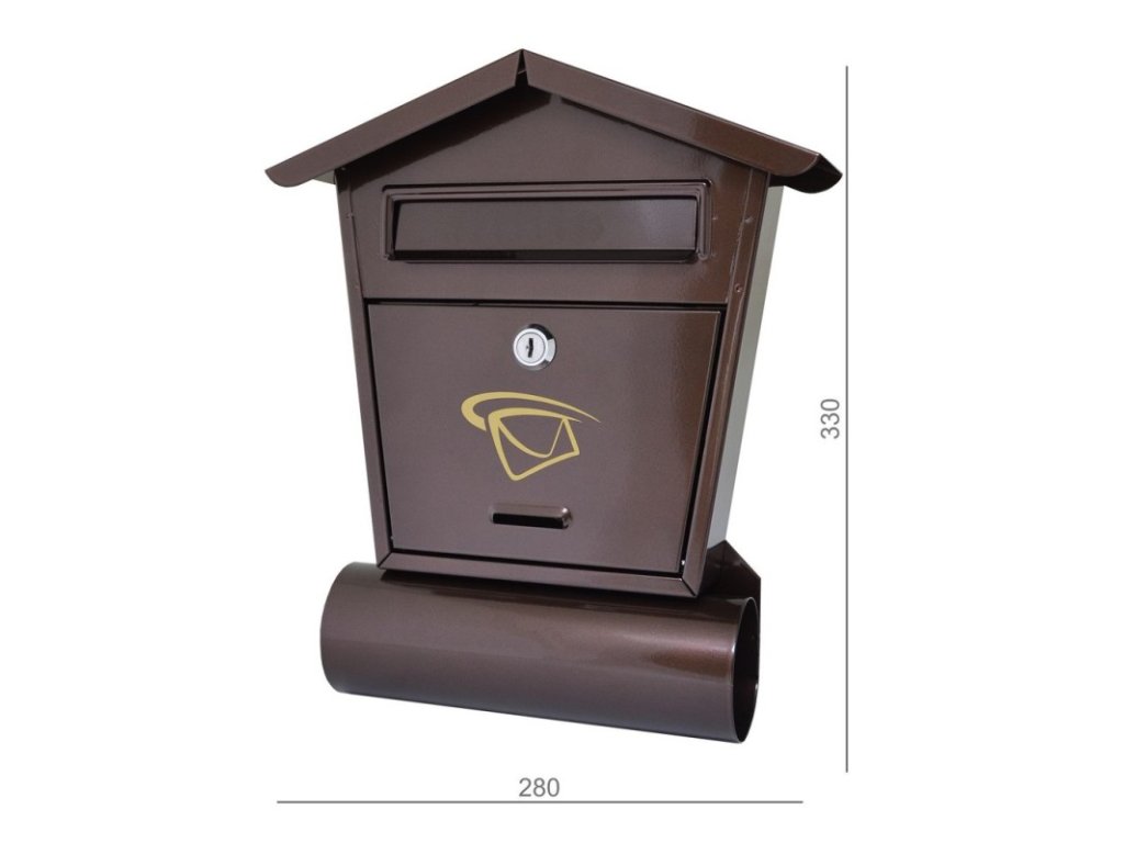 Pozinkovaná poštovní schránka o rozměrech 280x330x50 mm s tunelem na noviny ø70 mm, lakovaná hnědou barvou.