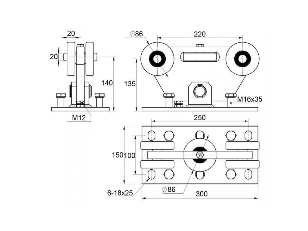 Celokovový vozík pro samonosné posuvné brány s hmotností do 500 kg a šířkou průjezdu až 8 m.
