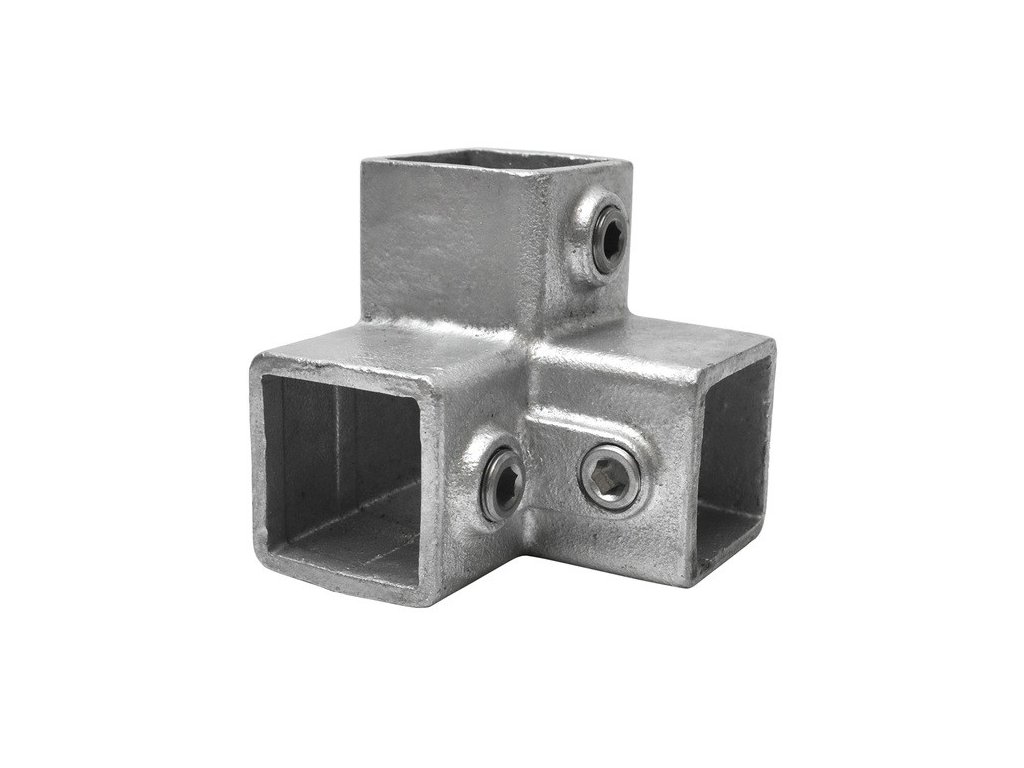 Pozinkovaná joklová spojka ve tvaru třícestného horního rohu je rohová spojka s úhlem 90°. Možné použití je pro rohy horních částí konstrukcí zábradlí nebo pro jakýkoli obdélníkový spoj.