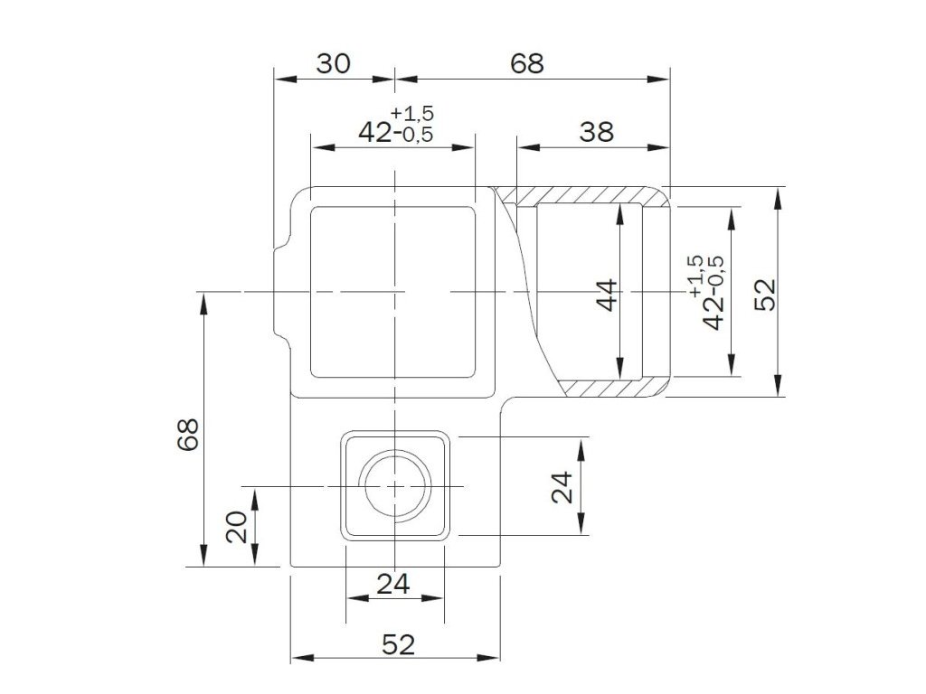 Rohové spoje ve tvaru vnitřního rohu s úhlem 90°. Používá se v jiných rozích než v horních rozích, tj. v rozích, které vyžadují pokračování profilu kloubového táhla.