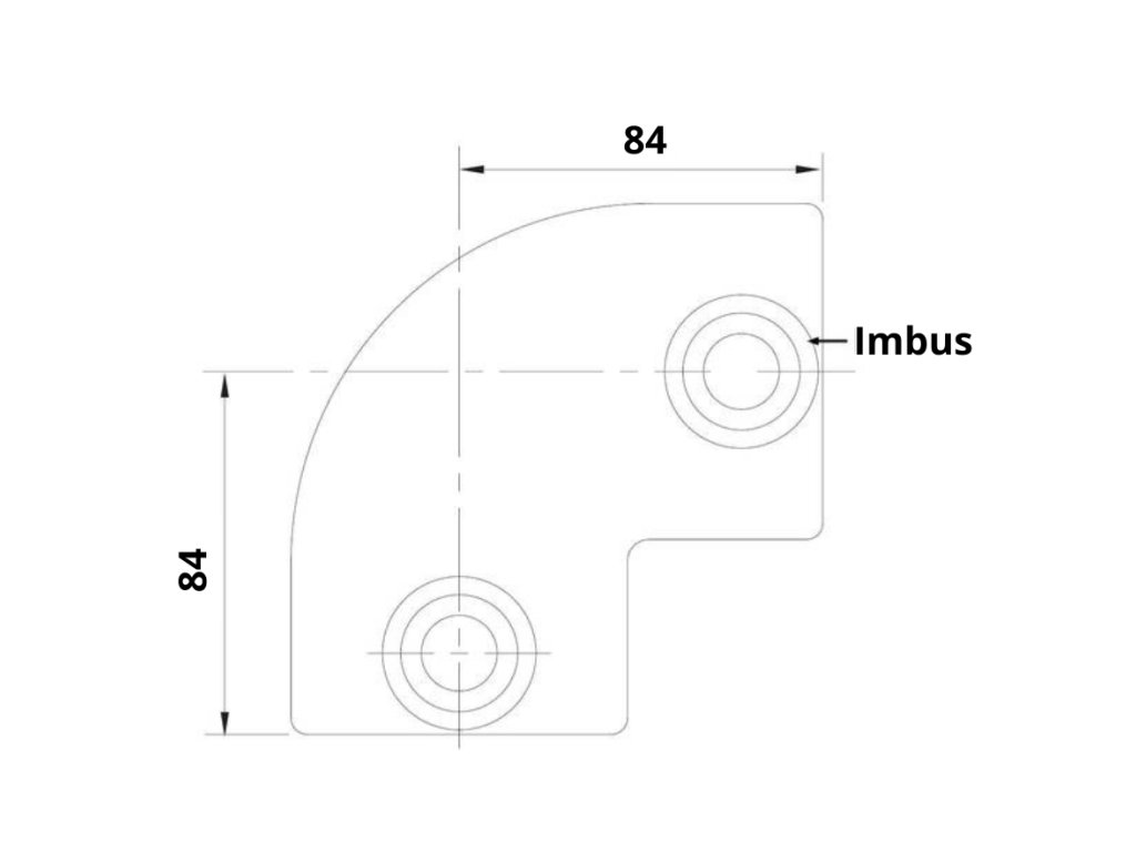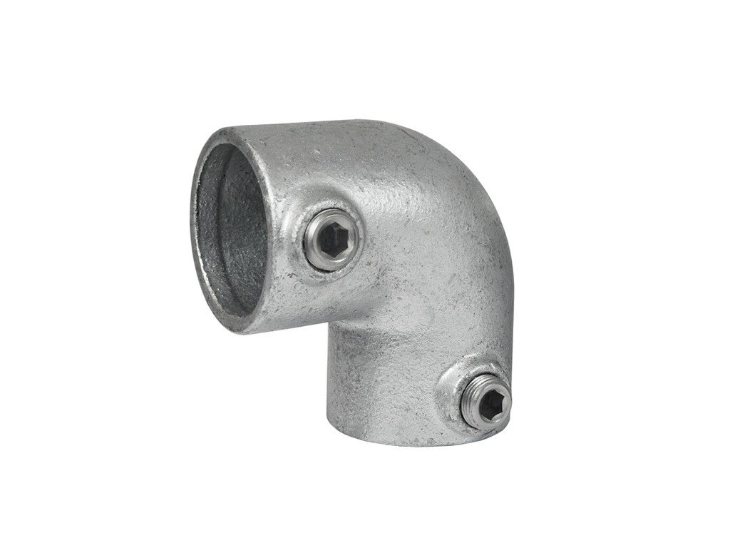 Pozinkovaná trubková spojka ve tvaru L, tj. s úhlem 90°. Tento tvar spojky se používá jako koncový tvar směru potrubí, například na konci horní části zábradlí.