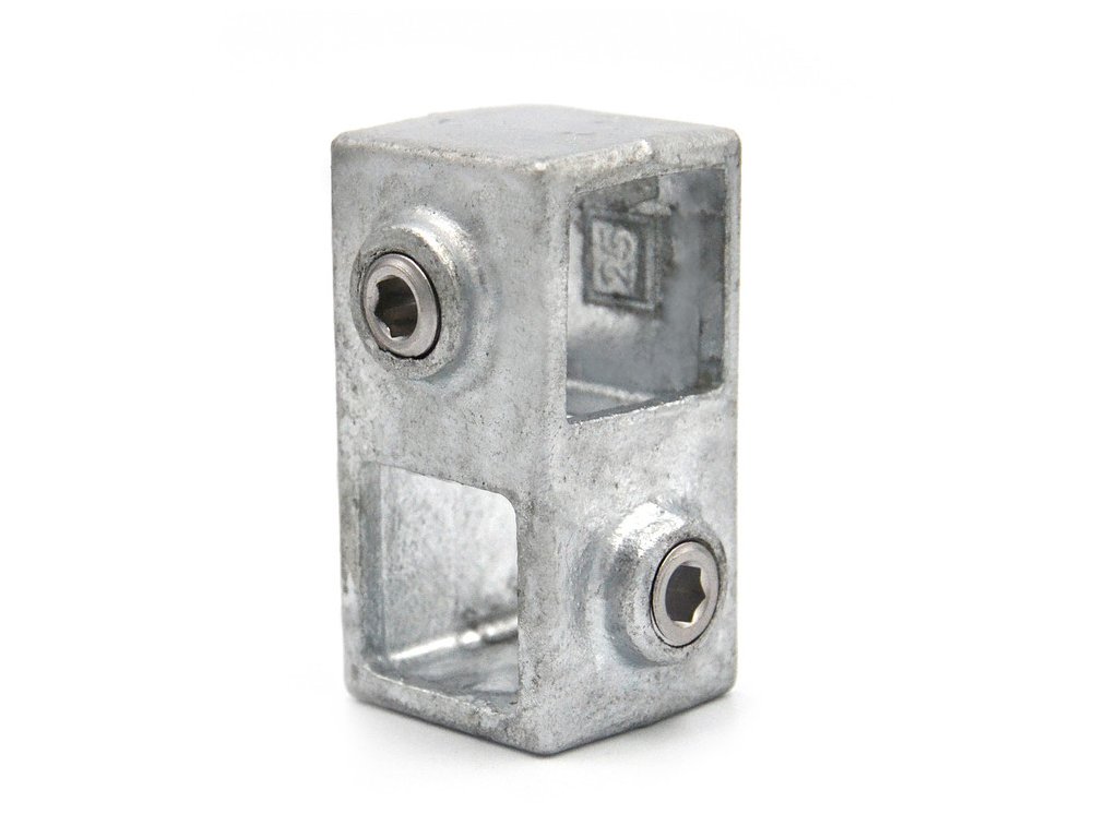 Pozinkovaný spojovací prvek 25x25 mm pro spojení dvou jeklů ve svislém kříži nad sebou pod úhlem 90°. Používá se v situacích, kdy pro zpevnění konstrukce není žádoucí řezání jeklu a spojování v křížové spojke.