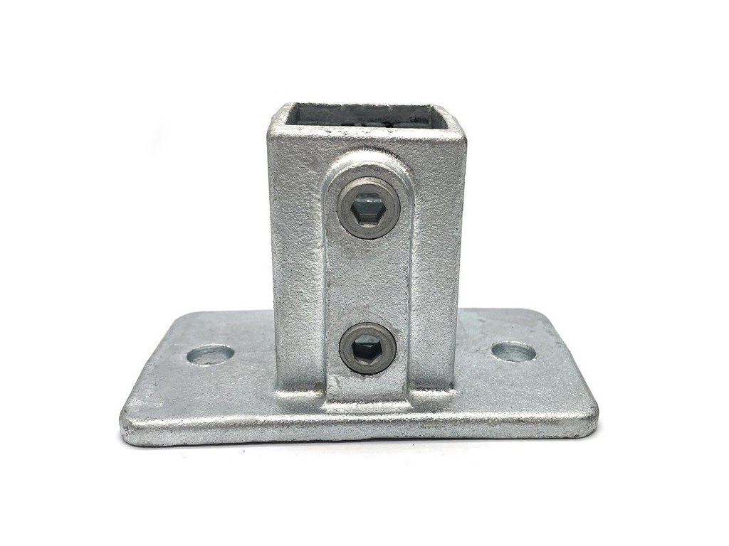 Pozinkovaná obdélníková základová příruba nebo zemní kotva je základem, který podpírá svislé třmeny. Kotva může být použita například jako základní příruba zábradlí nebo konstrukce.