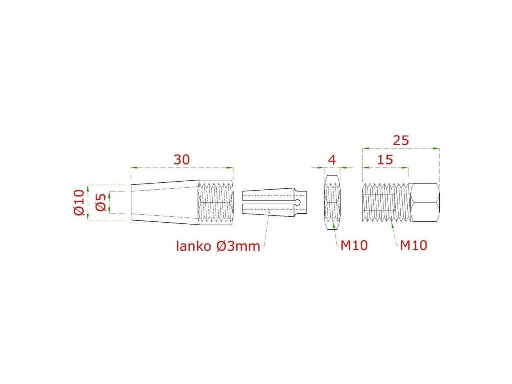 Rukojeť z nerezové oceli o průměru 3 mm. Rukojeť obsahuje závit M5.