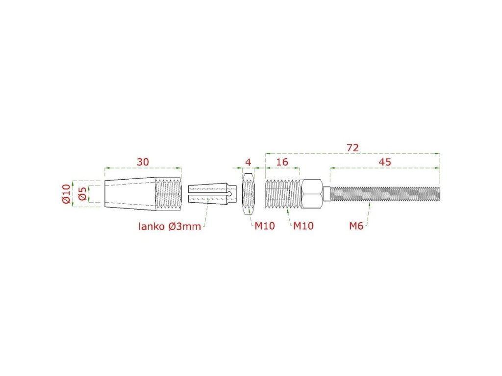 Pro nerezový drát o průměru 3 mm. Délka závitu je 45 mm.