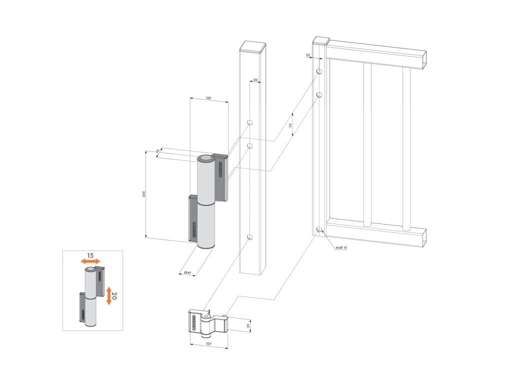 Přesné nastavení otvírače pro vaši bránu je možné s pomocí horizontální vyrovnání až o 15 mm a vertikální vyrovnání o 20 mm.