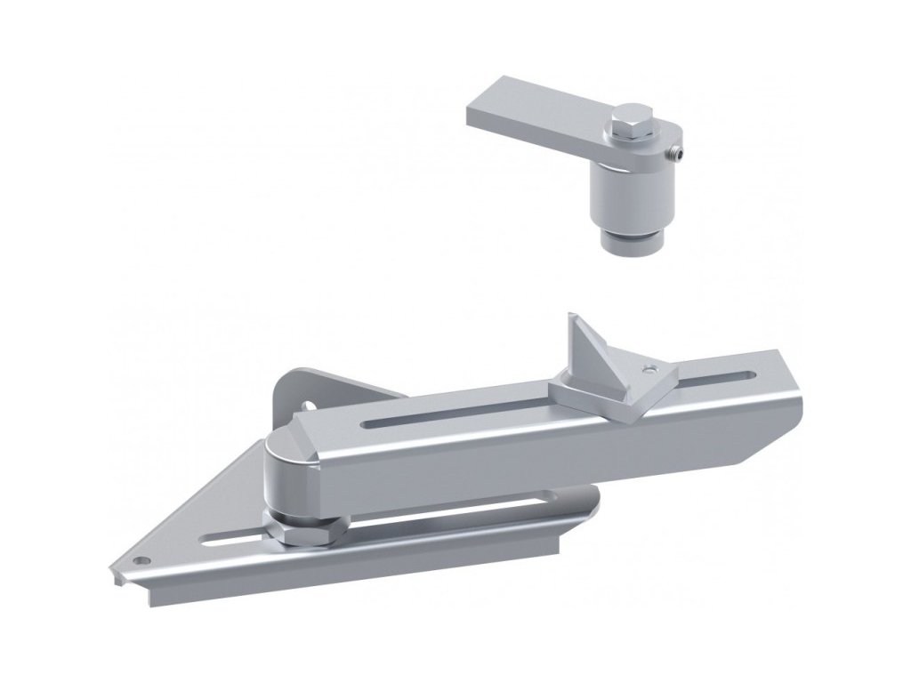 Pozinkované závěsy s kulovým kloubem pro brány do kopce. Maximální úhel sklonu je dán výškou brány. Pro tento typ křídlové brány je vhodné pohon předimenzovat.