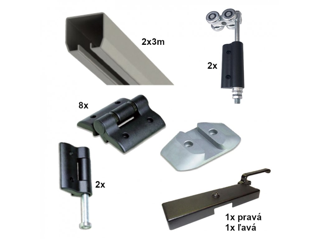 Sada pro výrobu dvoudílné skládací závěsné brány do 6m převýšení. Sada obsahuje 2x3 metry profilu, dva vozíky a dvě spodní linky, 8 kusů závěsů, spodní zarážku a 2 madla - pravé a levé provedení.
