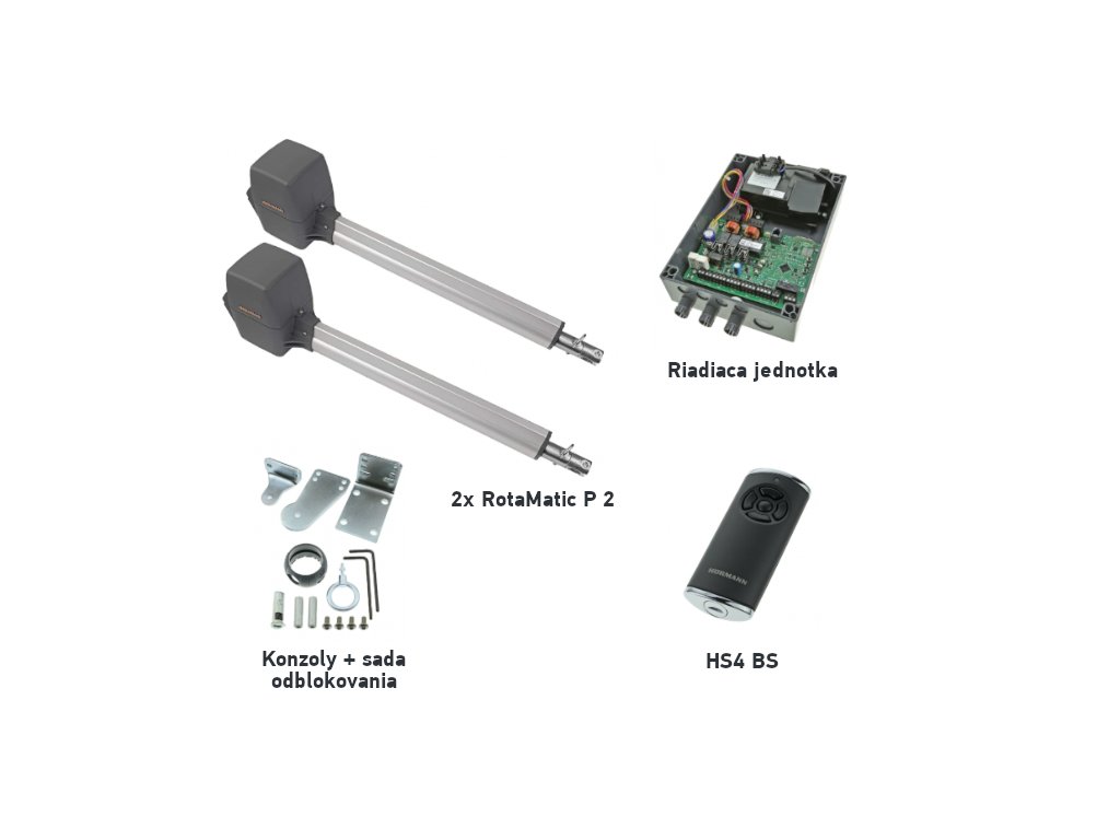 Sada pohonů Hörmann RotaMatic P 2 je určena pro automatizaci pro křídlové brány na délku křídla 2,5 m a hmotnost až do 400 kg. Pohon je založen na technologii 24V. Pohon je nevratný . Manuál ke stažení ».
