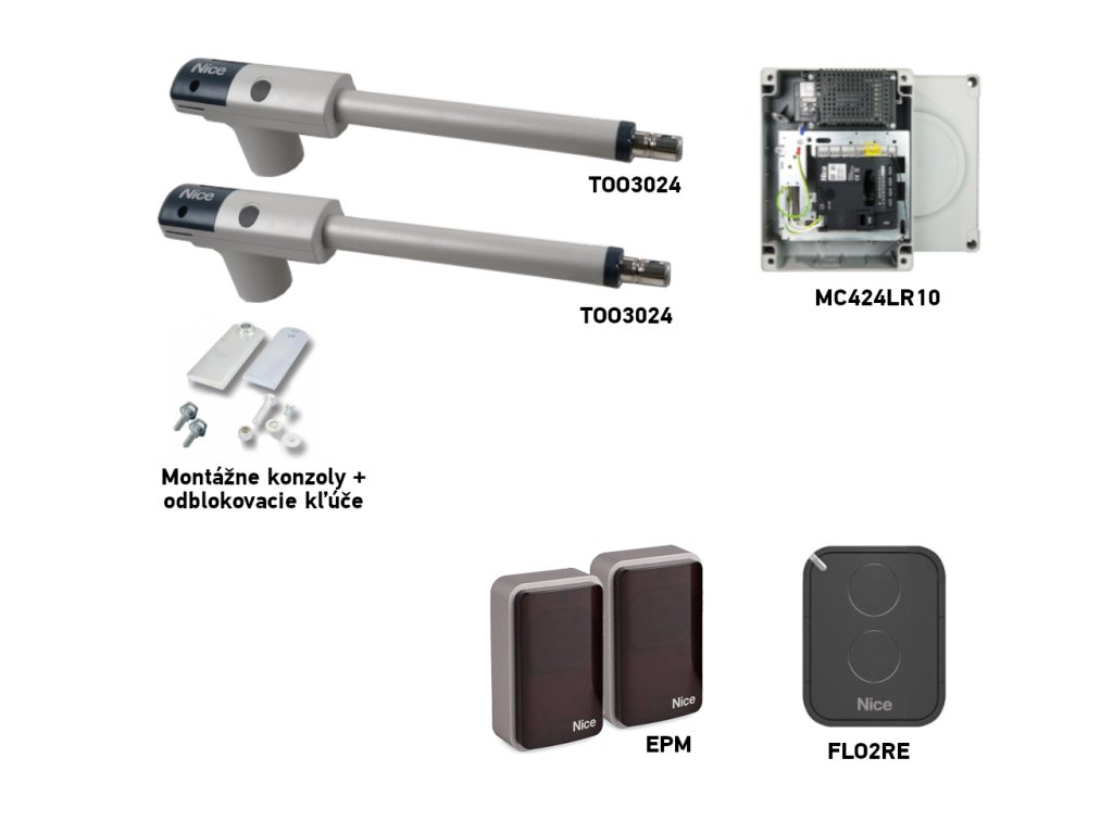 Sada pohonu NICE TOO TOO3024 pro dvoukřídlou bránu - jedno křídlo 3m/300kg s fotobuňkami