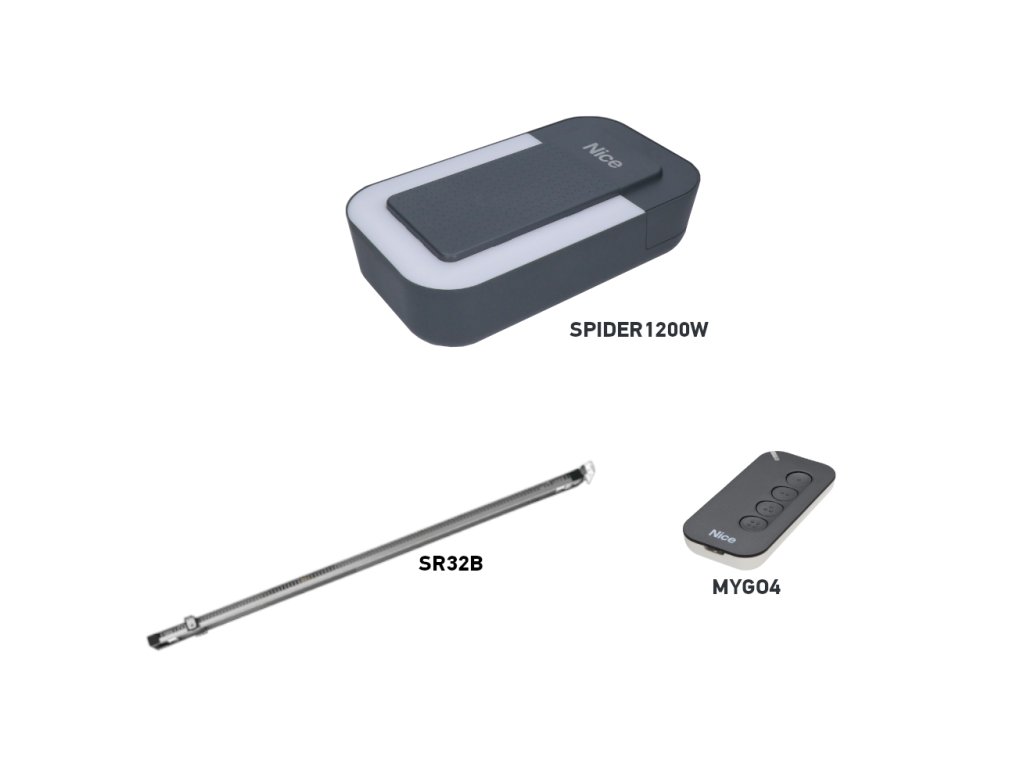 Garážový pohon NICE SPIDER 1200W je elektromechanický pohon s napájením 230V, s řídící jednotkou NICE MCU4 se zabudovaným přijímačem a Wi-Fi modulem v sestavě s řemenovou dráhou.