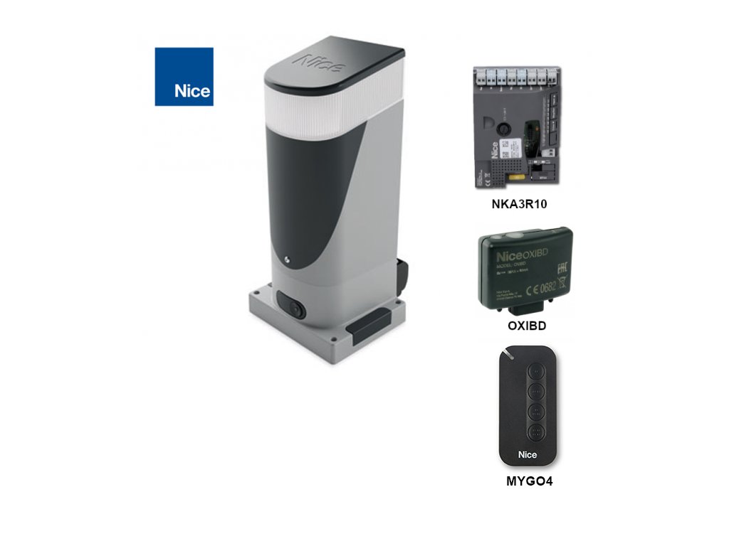 Elektromechanický pohon NICE Slight SLH400 s řídicí jednotkou NKA3R10 s celkovou nosností brány až 400 kg a délkou křídla až 6 m. |