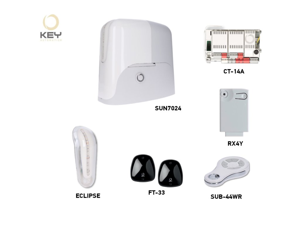 Pohon KEY SUN7024 je určen pro posuvné brány závaží do 700 kg a šířku průjezdu do 6,5 m (doporučená hmotnost 450 kg). Součástí pohonu je vestavěné světlo. Moje elektromechanické stop spínač. Pohon je nevratný.