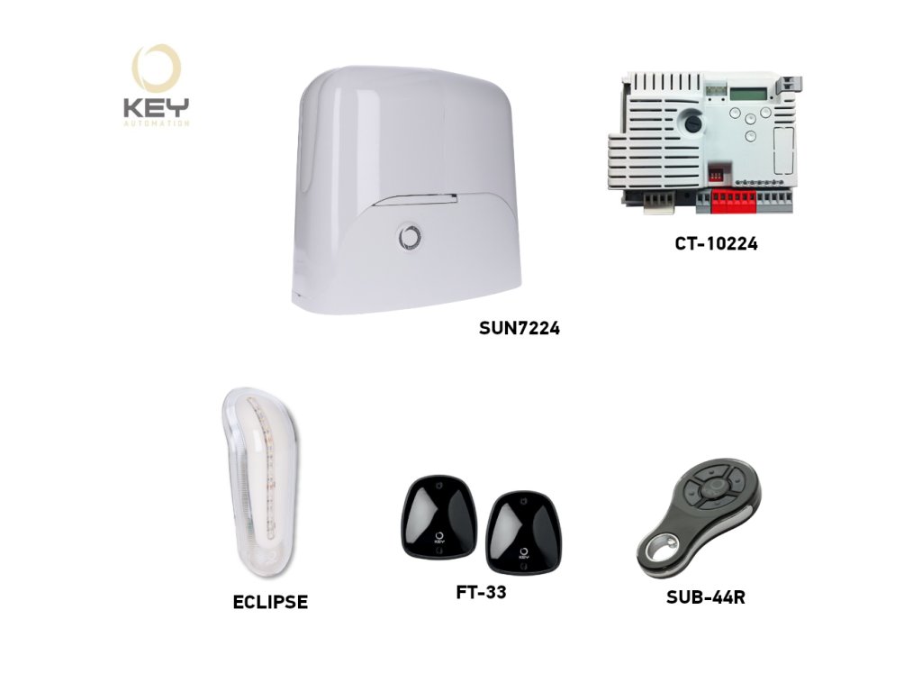 Pohon KEY SUN7224 je určen pro posuvné brány závaží do 700 kg a šířku průjezdu do 6,5 m (doporučená hmotnost 450 kg). Pohon obsahuje vestavěný přijímač. Moje elektromechanické stop spínač. Pohon je nevratný.