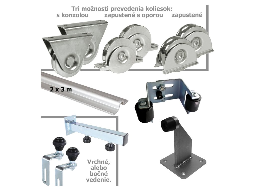 Sada pro výrobu posuvných kolejnicových bran do šířky průjezdu 3 m. Všechny komponenty jsou pozinkované (kolejnice a hrany). Sada obsahuje vysoce kvalitní kolečka s ložisky. Kola jsou přišroubována nebo přivařena ke spodní části rámu brány. Kolečka si můžete vybrat podle způsobu jejich ukotvení k bráně, nejčastěji se používají kolečka s držáky. Trať je navržena tak, aby po ní mohl projet nákladní automobil. Zábradlí lze ukotvit do vzrostlého základu nebo přímo do chodníku. Zarážky vymezují koncovou polohu mechanicky. Koncové polohy by měly být definovány také při použití pohonu, který má vlastní koncové dorazy. Vedení nahoře stabilizuje pohyb brány, není příliš namáháno, většina hmotnosti se přenáší dolů na kola.