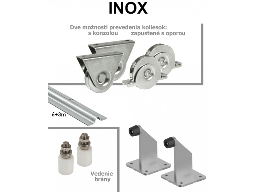 Sada pro výrobu posuvných kolejnicových bran do šířky průjezdu 4,5 m. Všechny součásti jsou z nerezové oceli. Sada obsahuje vysoce kvalitní kolečka s ložisky. Kola jsou přišroubována nebo přivařena ke spodní části rámu brány. Kolečka si můžete vybrat podle způsobu jejich ukotvení k bráně, nejčastěji se používají kolečka s držáky. Trať je navržena tak, aby po ní mohl projet nákladní automobil. Zábradlí lze ukotvit do vzrostlého základu nebo přímo do chodníku. Zarážky vymezují koncovou polohu mechanicky. Koncové polohy by měly být definovány také při použití pohonu, který má vlastní koncové dorazy. Vedení nahoře stabilizuje pohyb brány, není příliš namáháno, většina hmotnosti se přenáší dolů na kola.