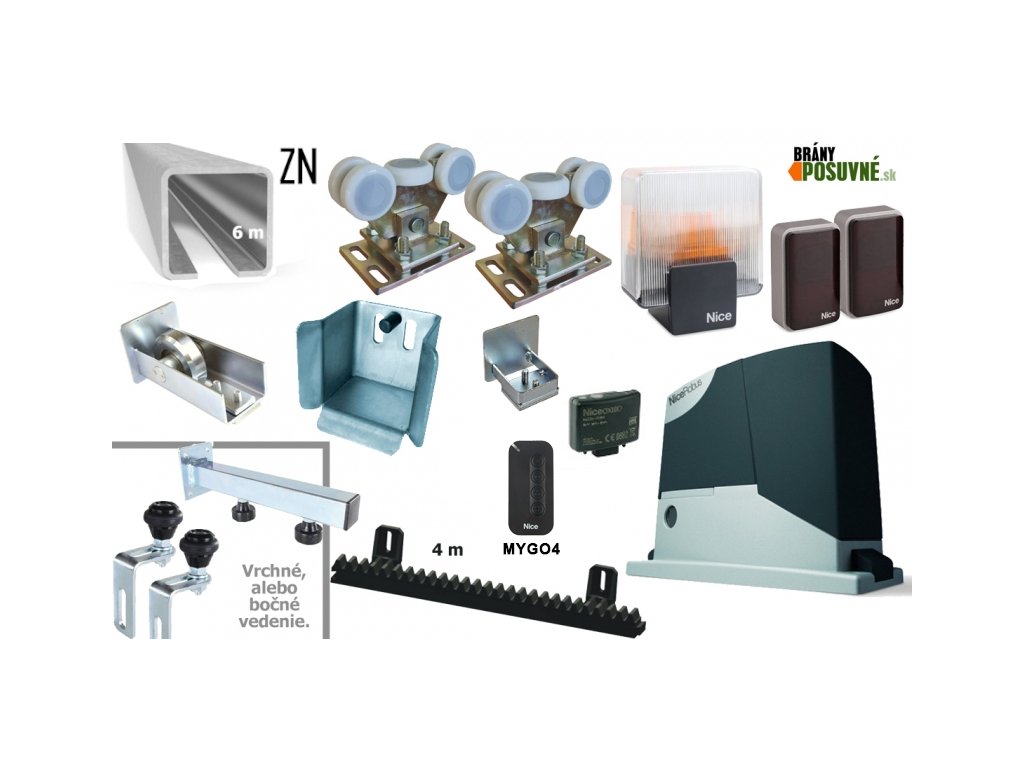 Sada obsahuje také kompletní sadu pro automatizaci posuvné brány: pohon brány a elektronické příslušenství(ovladače, maják, fotobuňky).